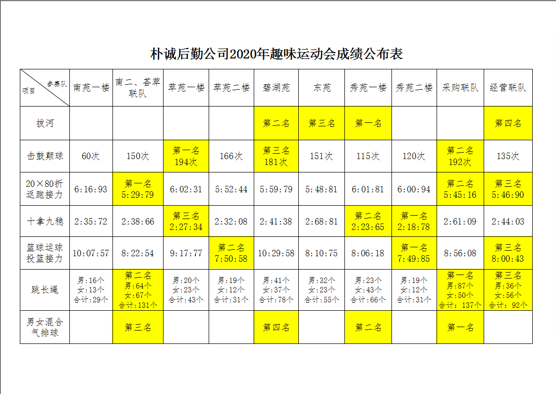 ? 經(jīng)過激烈的比賽角逐,擊鼓顛球、20x80折返跑接力、十拿九穩(wěn)、籃球運球投籃接力、跳長繩項目都產(chǎn)生了前三名,拔河和男女混合排球產(chǎn)生了前四名,成績結(jié)果如下圖所示: